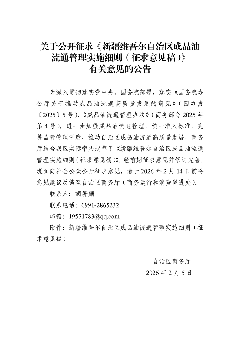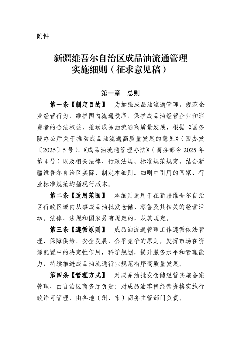 关于公开征求《新疆维吾尔自治区成品油流通管理实施细则(征求意见稿)》有关意见的公告