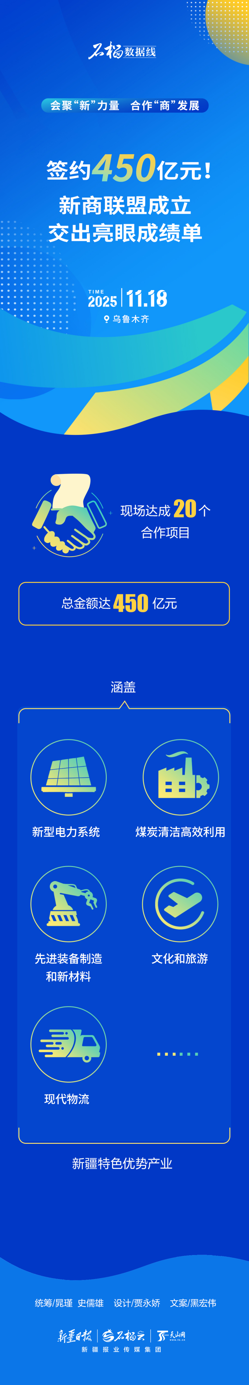 现场达成20个合作项目,总金额达450亿元,涵盖新型电力系统、煤炭清洁高效利用、先进装备制造和新材料、文化和旅游、现代物流等新疆特色优势产业。