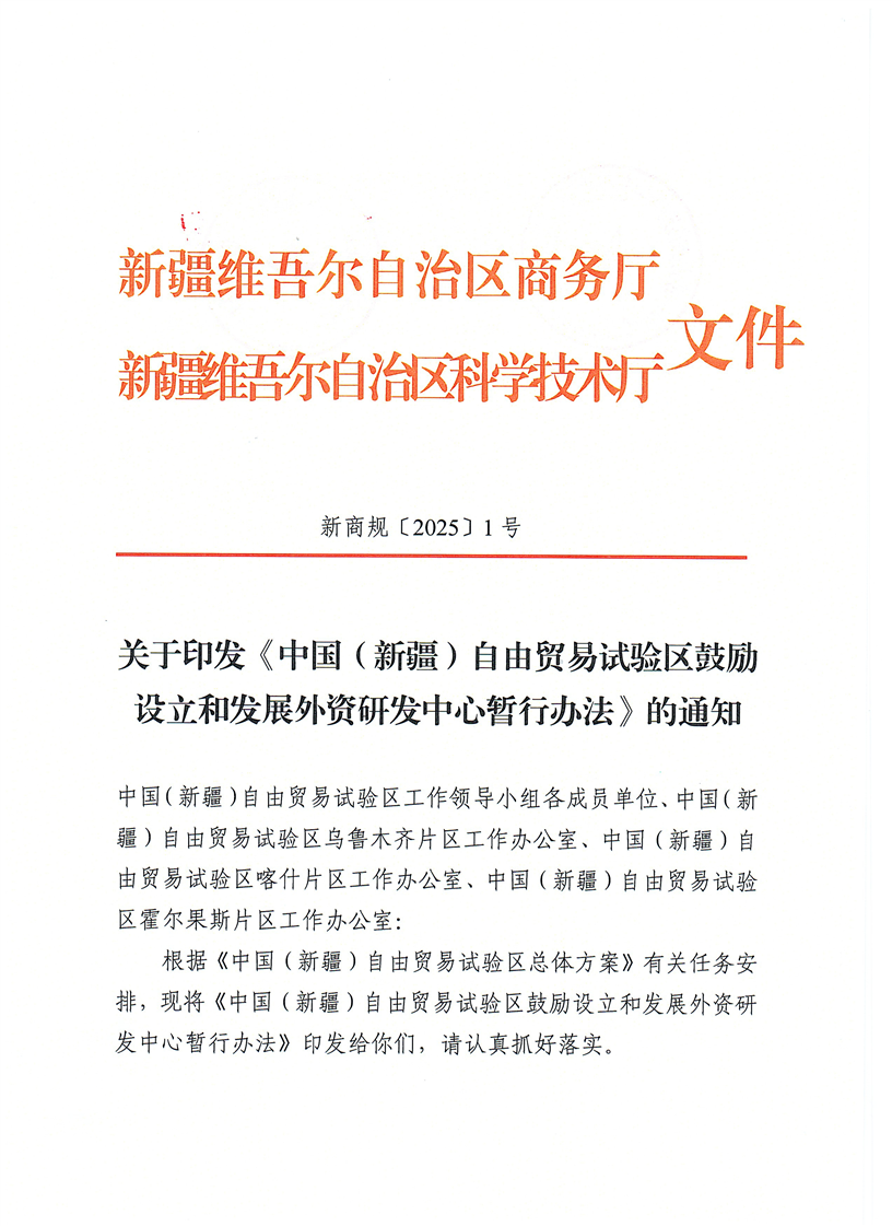 关于印发《中国(新疆)自由贸易试验区鼓励设立和发展外资研发中心暂行办法》的通知