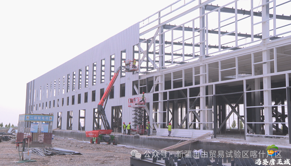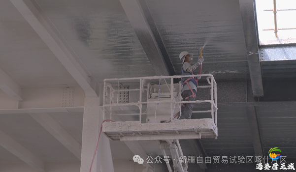 近日,走进喀什综合保税区粤兵物流产业建设项目施工现场,两层仓库钢结构主体已搭建完毕,工人正加紧进行外墙板安装与防火涂料喷涂,现场一片繁忙有序的景象。