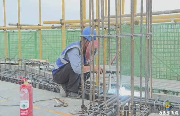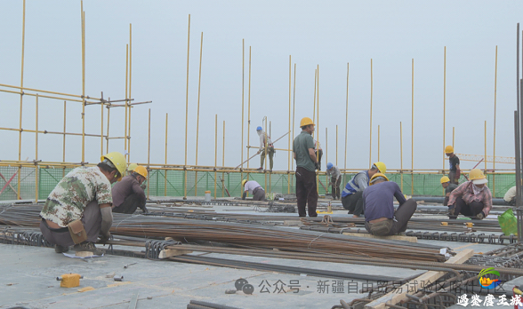 同样火热的建设场景还出现在兵团分区北部产业园区跨境经贸交流中心项目现场。200余名工人分散在各个作业面,绑扎钢筋、搭建框架,主体建筑轮廓清晰,施工进度正按照计划稳步推进。