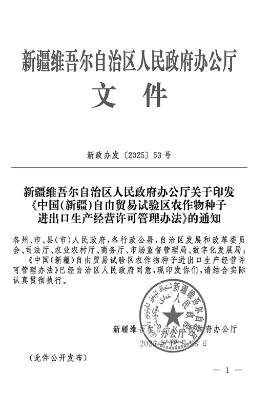 新疆维吾尔自治区人民政府办公厅关于印发《中国(新疆)自由贸易试验区农作物种子进出口生产经营许可管理办法》的通知