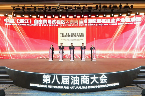 10月22日上午,中国(浙江)自由贸易试验区大宗商品资源配置枢纽全产业链联盟(以下简称“联盟”)在第八届油商大会上正式揭牌。浙江省副省长胡伟,物产中大集团董事长陈新,省商务厅厅长、省自贸办主任周向军,舟山市委书记何中伟,宁波市政府党组成员、宁波经开区管委会主任叶苗为联盟揭牌。中国(浙江)自由贸易试验区工作领导小组办公室(省自贸办)、省委金融办、省发展改革委、省交通运输厅、省海洋经济厅、省国资委等负责人,杭州市上城区区长惠海涛、联盟理事单位代表出席活动。