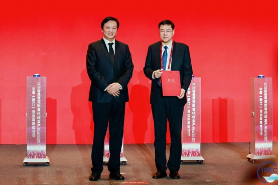 浙江省副省长胡伟为联盟首届理事长、物产中大集团董事长陈新授聘书。