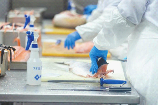 四川美沿远洋食品有限公司内,工人正在对三文鱼进行加工。
