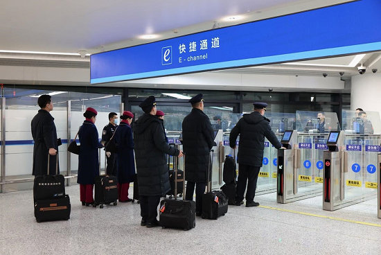 图为乌鲁木齐出入境边防检查站民警协助南航国际航班机组人员使用“快捷通道。