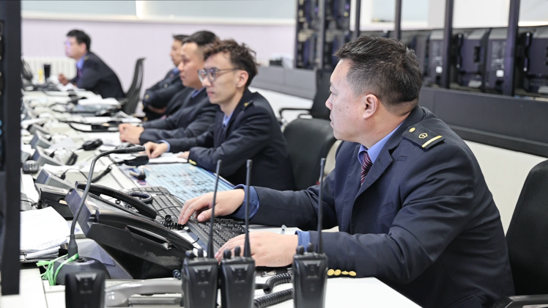 阿拉山口站运转车间干部在综合行车室盯控班列发车。布仁巴特 摄