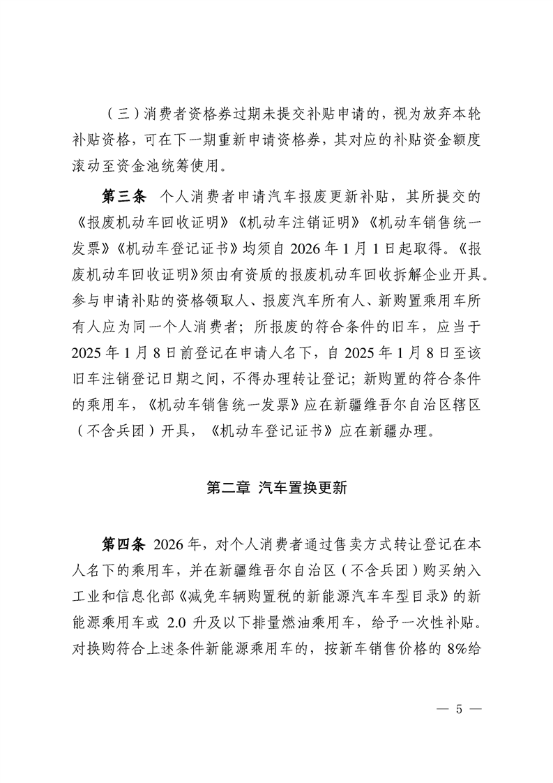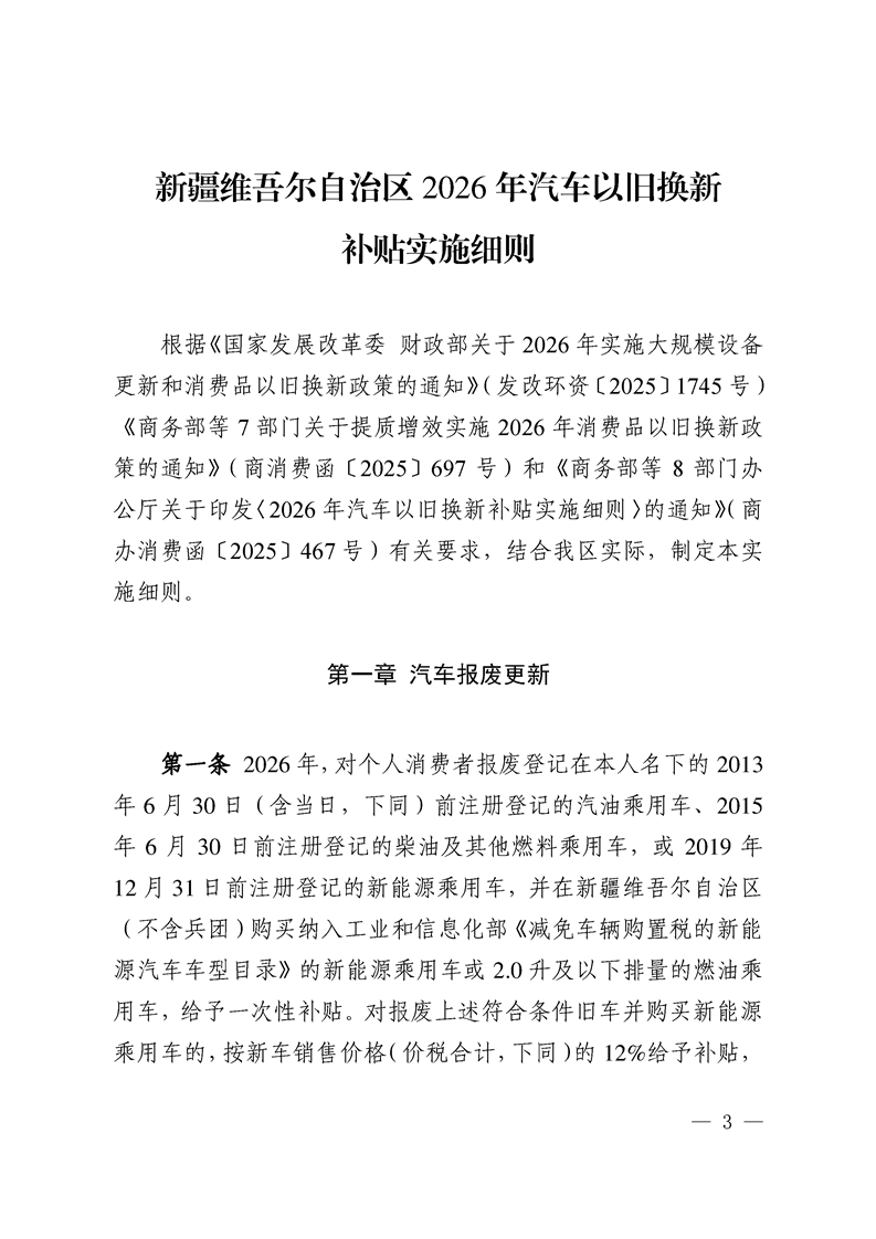 关于印发《新疆维吾尔自治区2026年汽车以旧换新补贴实施细则》的通知